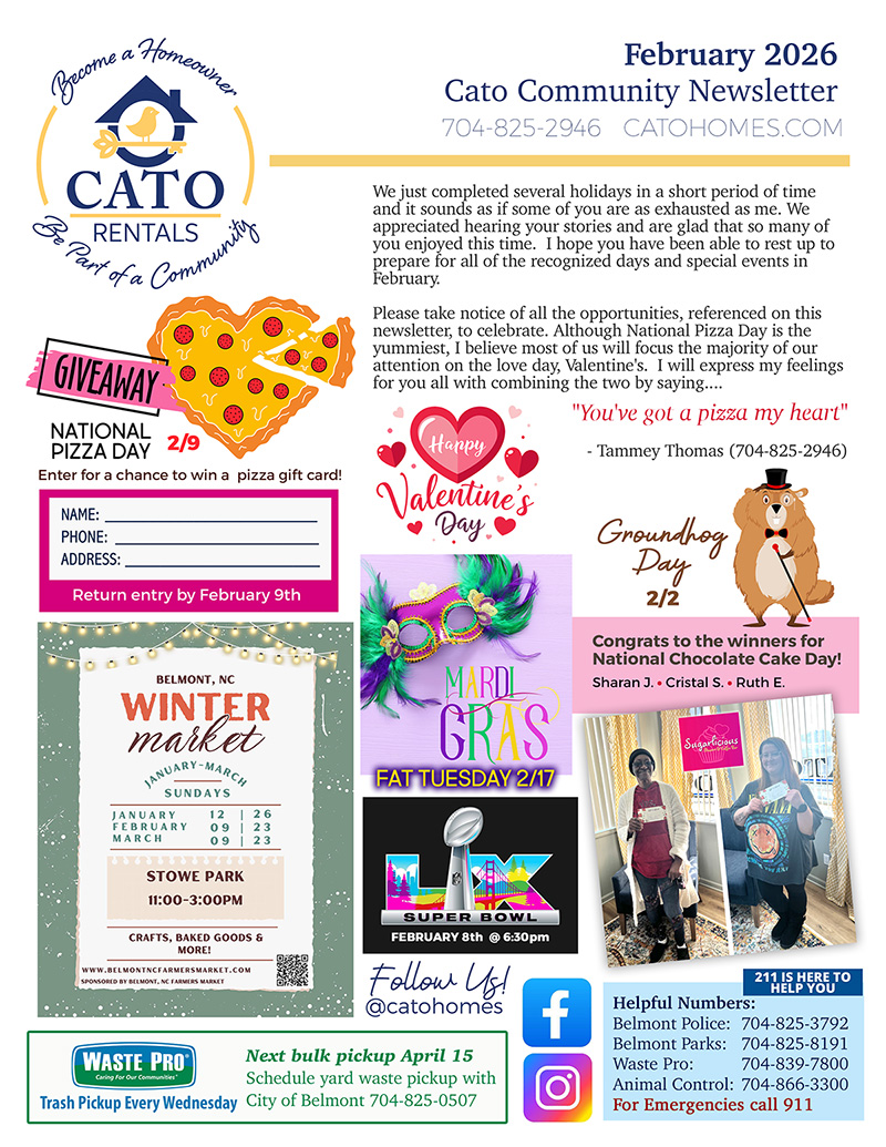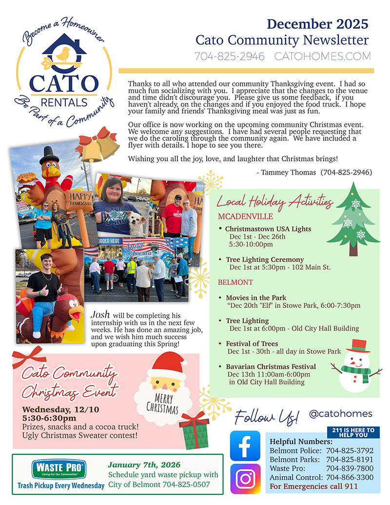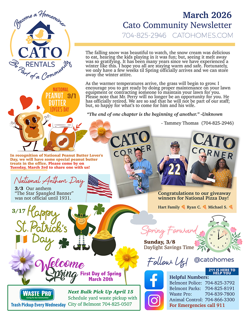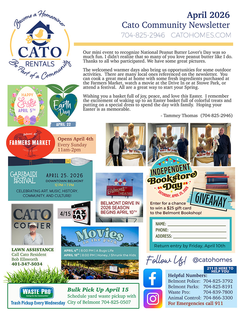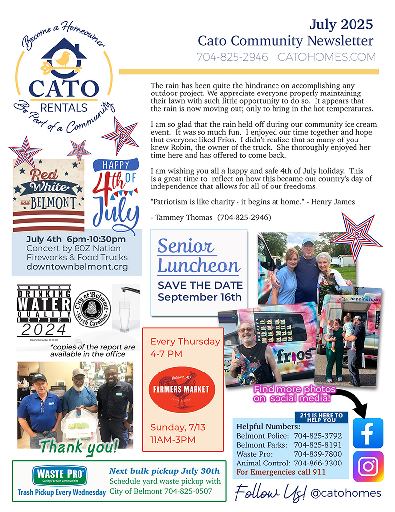 Community Newsletters ARCHIVED NEWSLETTERS Charlotte Area’s Finest Manufactured Home Community! CATO HOMES7101 Wilkinson Blvd.Belmont, NC 28012704-825-2946 Contact Us Today! Hours of Operation Monday – Friday: 9:00 a.m. – 5:00 p.m. Weekends: Appointments Available!