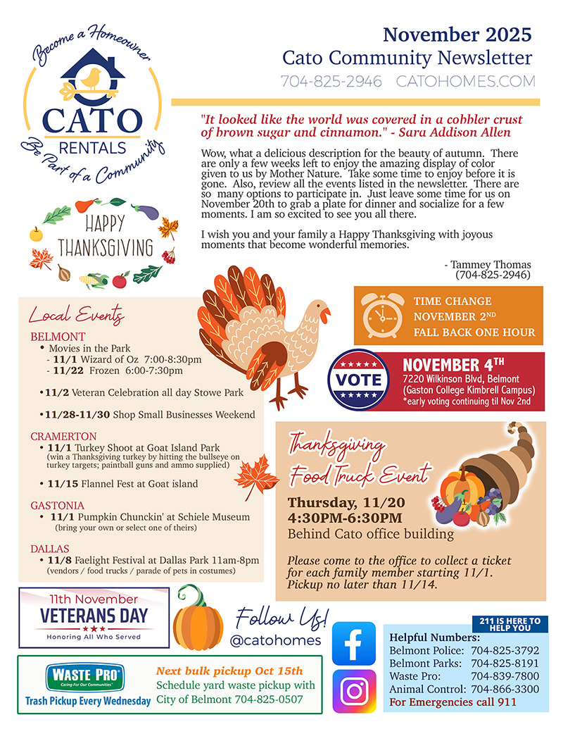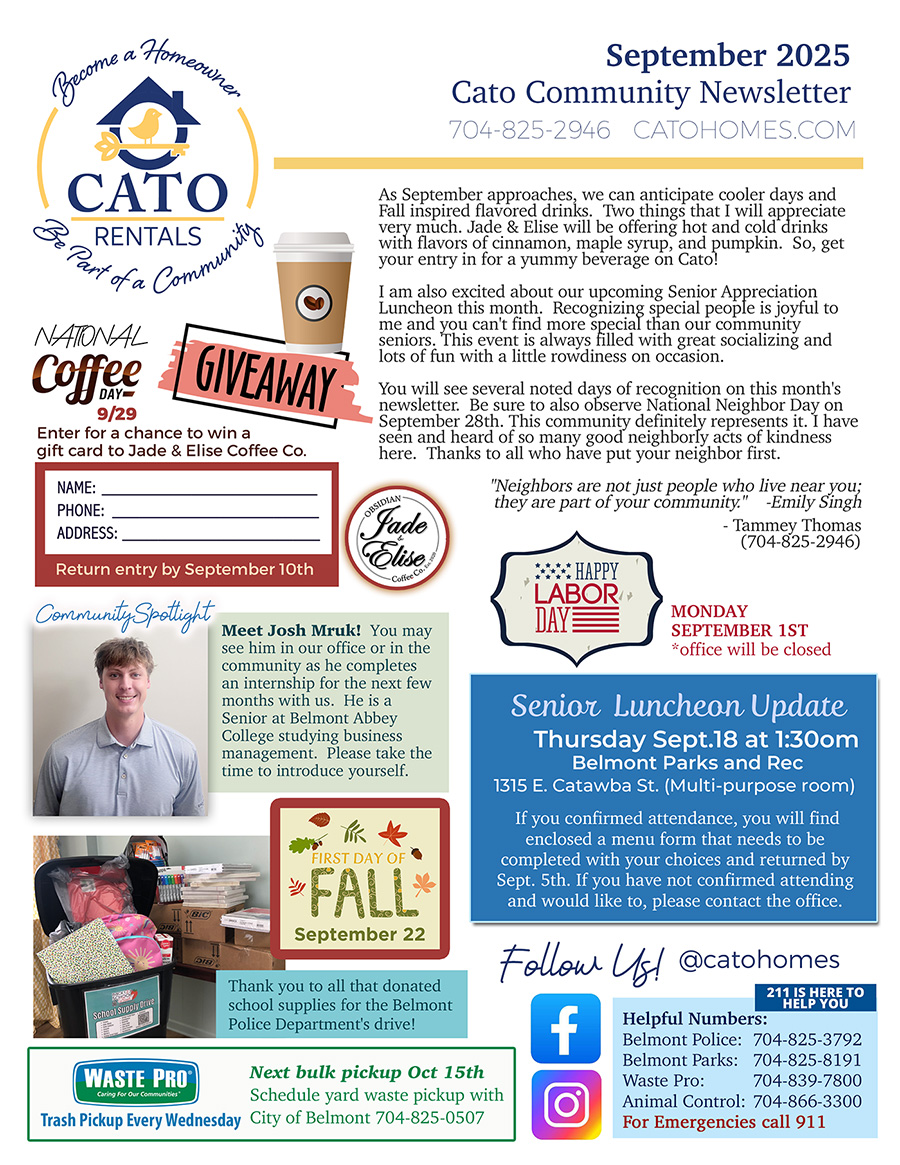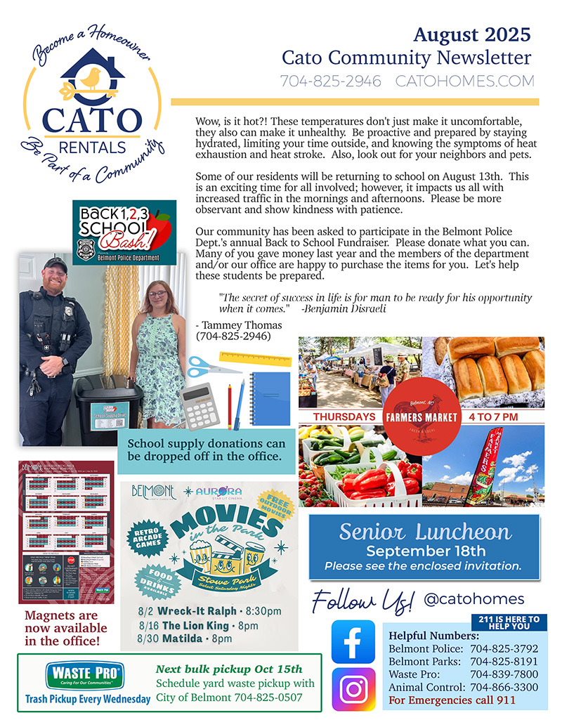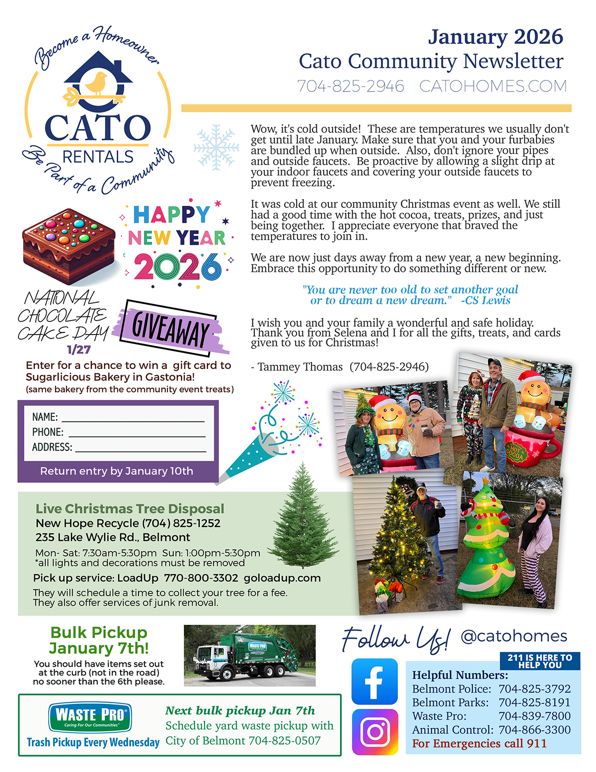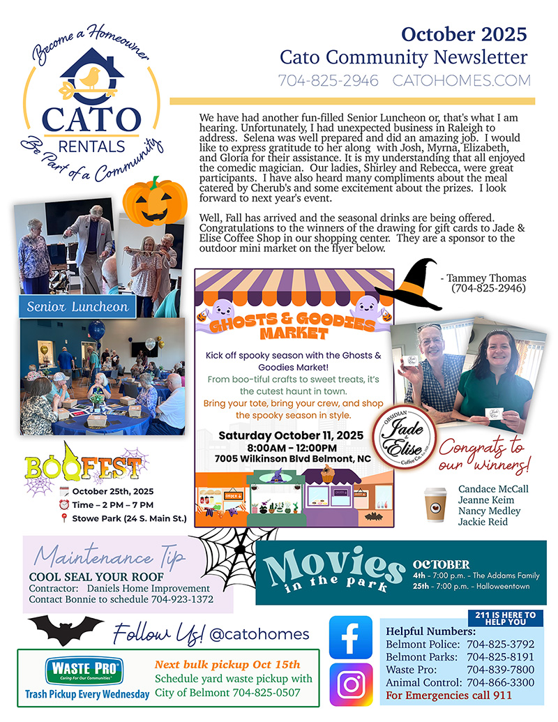 Community Newsletters ARCHIVED NEWSLETTERS Charlotte Area’s Finest Manufactured Home Community! CATO HOMES7101 Wilkinson Blvd.Belmont, NC 28012704-825-2946 Contact Us Today! Hours of Operation Monday – Friday: 9:00 a.m. – 5:00 p.m. Weekends: Appointments Available!